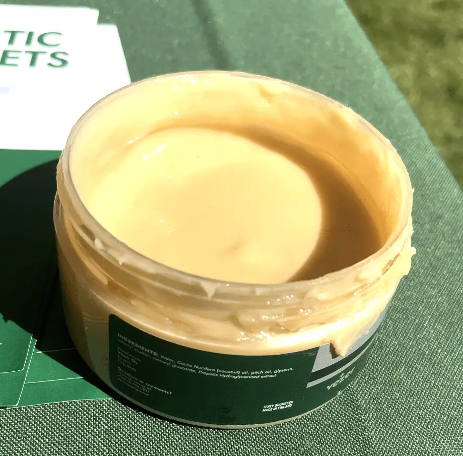 Treatment cream for animal skin problems. Softens calluses, treats cuts and small scratches, eases skin itching and scaling. Works great for dogs paws, and horses summer rash. Also soothes skin irritation from insect stings and bites. The Pitch Oil in the cream heals but also is a natural fly repellent as well as reduces licking of wounds.